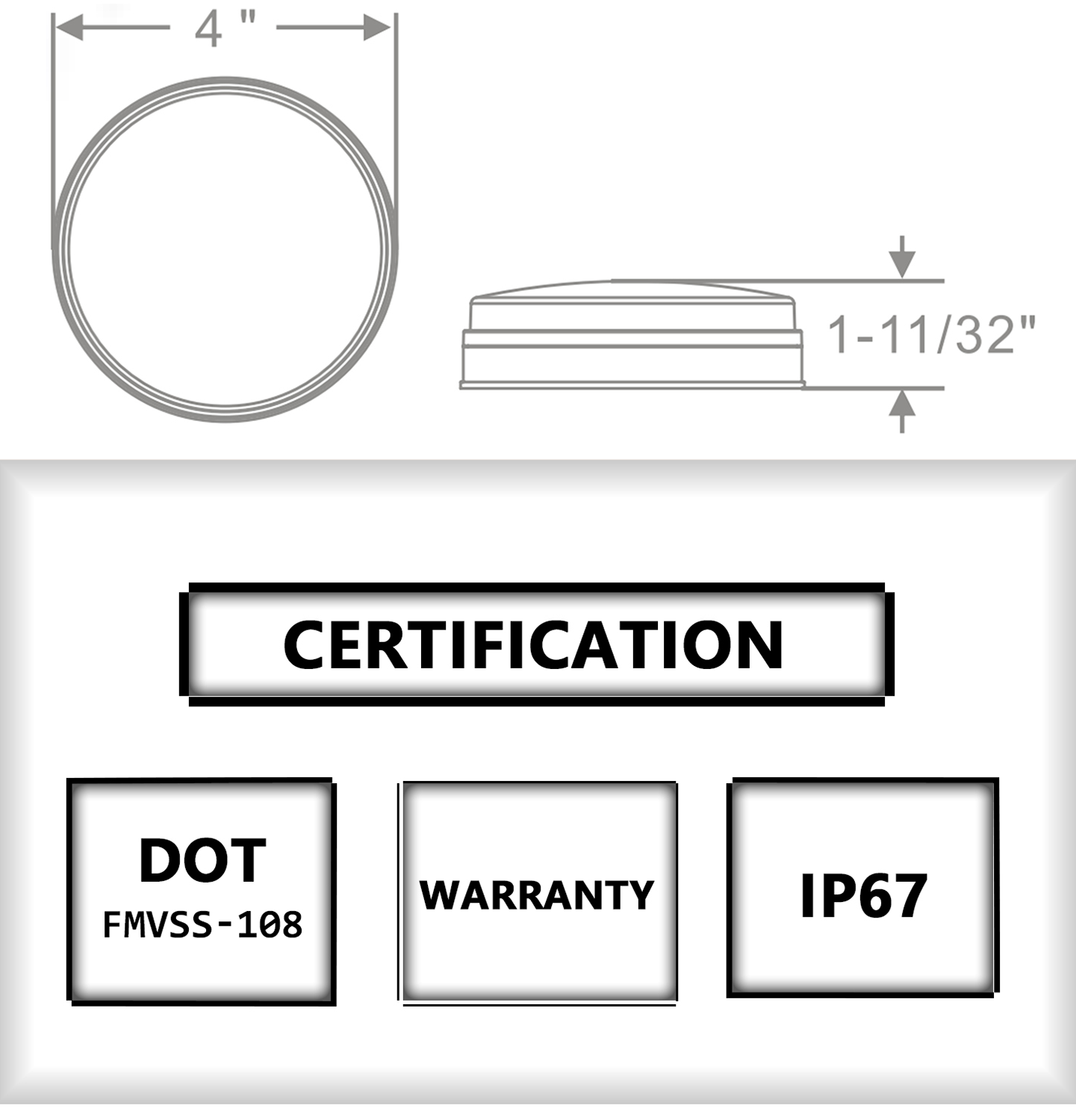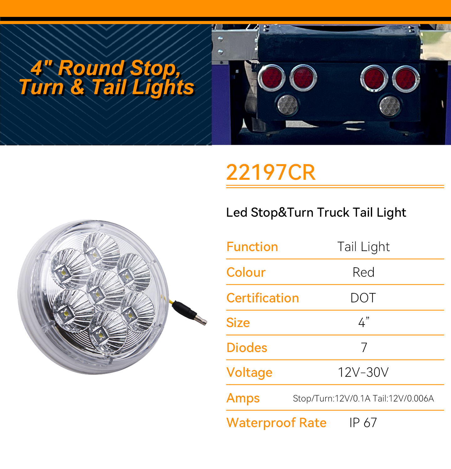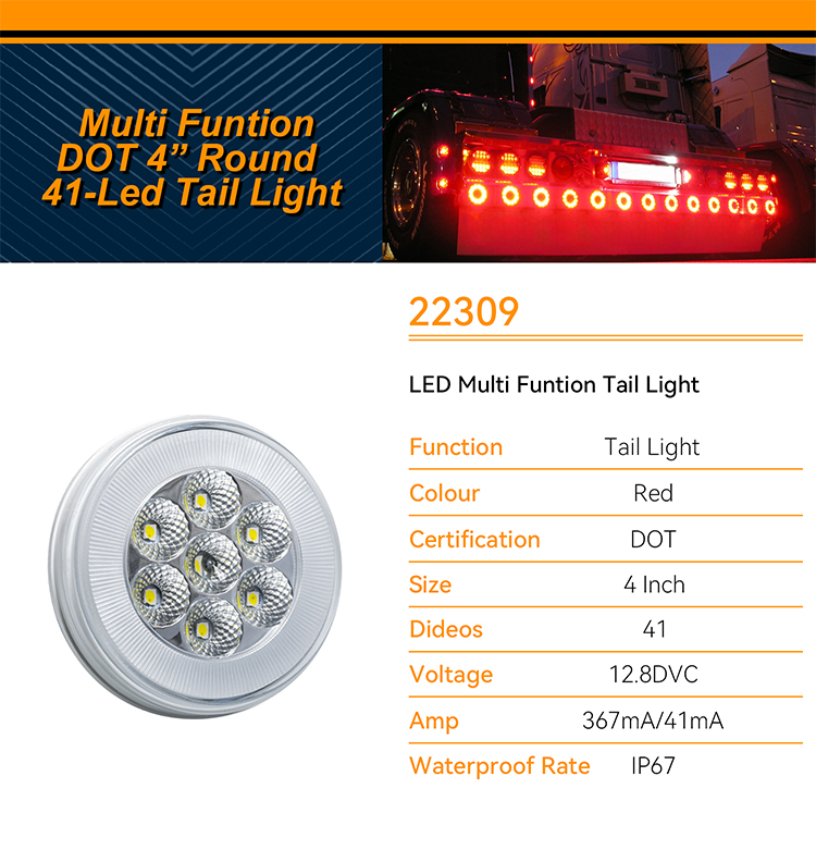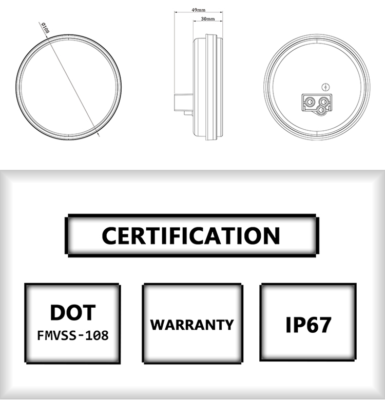 FMVSS: STI Materiale: lente e alloggiamento in policarbonato Voltaggio: 12V o 24V Ampere: Arresto/Giro: 12 V/0,1 A, Coda: 12 V/0,006 A Tasso di impermeabilità: IP67 Garanzia: 1 anno