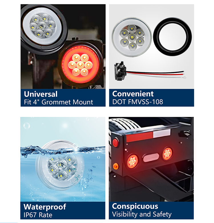 Luci di stop e di coda rotonde da 4 pollici Sigillato sonicamente, impermeabile Accetta la spina standard PL-3 Disponibili modelli con gommino incassato e con montaggio a flangia 3 funzioni in 1 luce