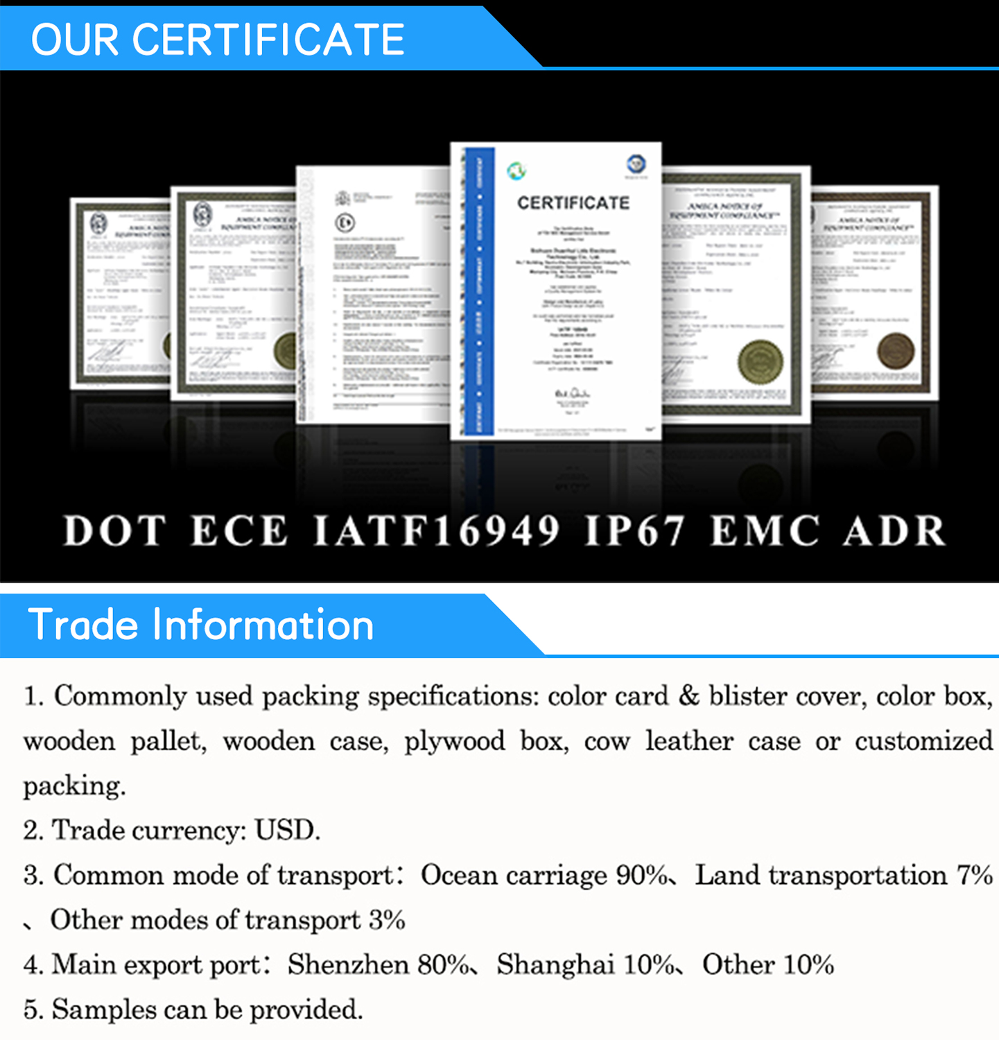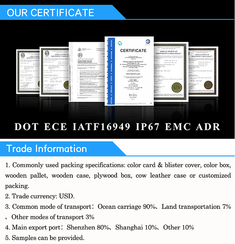FMVSS: STI Materiale: lente e alloggiamento in policarbonato Voltaggio: 12V o 24V Ampere: 12V/(HB)339mA, (LB)170mA, (W)66mA Tasso di impermeabilità: IP67