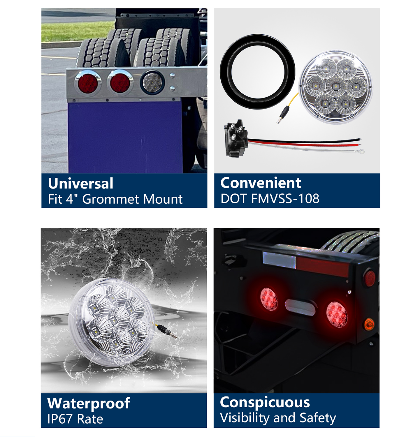 FMVSS: P2 Materiale: lente e alloggiamento in policarbonato, riflettore metallizzato sotto vuoto Voltaggio: 12V o 24V Ampere: Arresto/Giro: 12 V/0,25 A, Coda: 12 V/0,016 A Tasso di impermeabilità: IP67 Garanzia: 1 anno